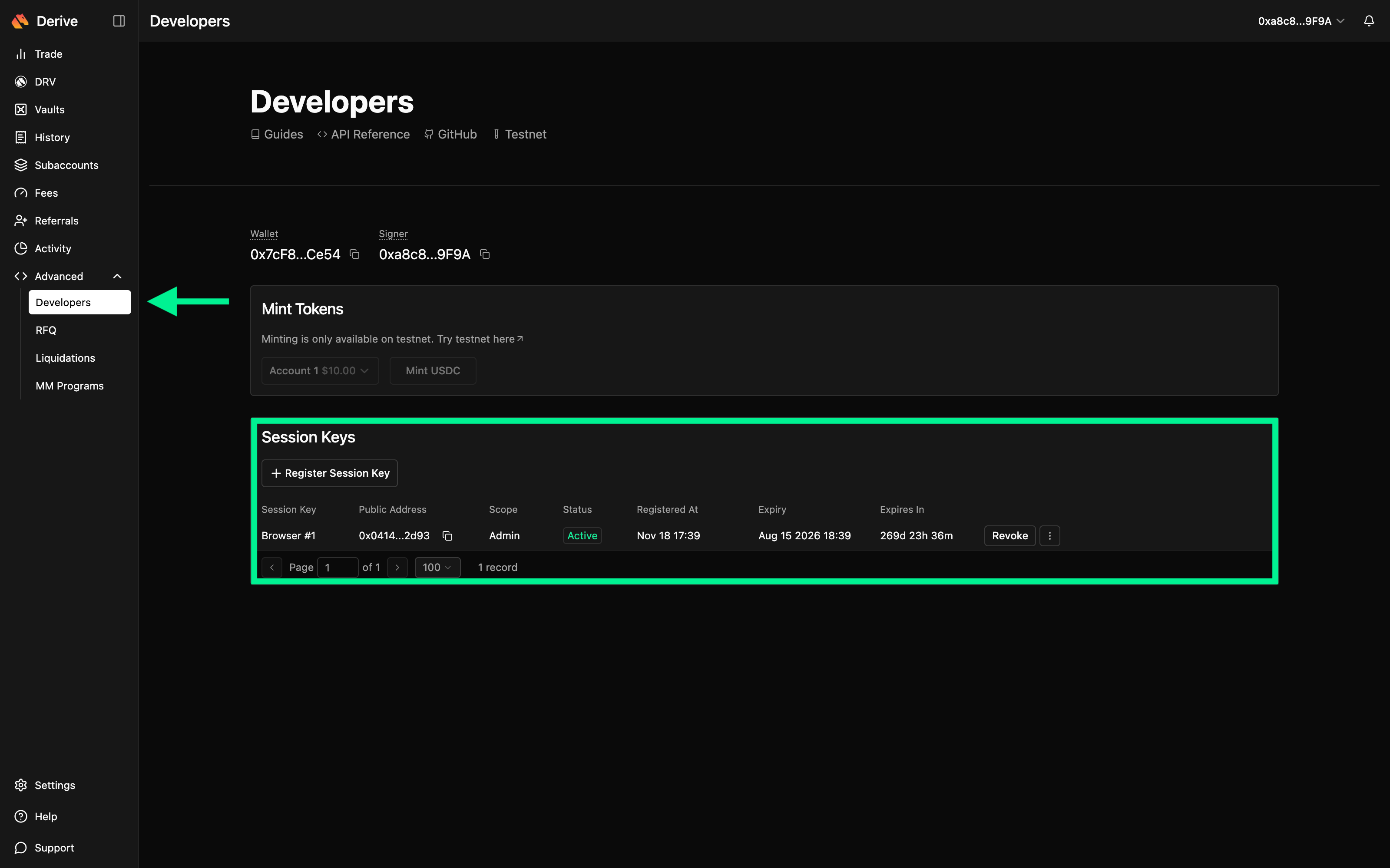 - Device Session Keys: created when a user deposits and trades via the UX. To enable instant deposits and trades, a random session private key is generated, registered and encrypted in the browser's local storage. You can manually revoke device session keys below.