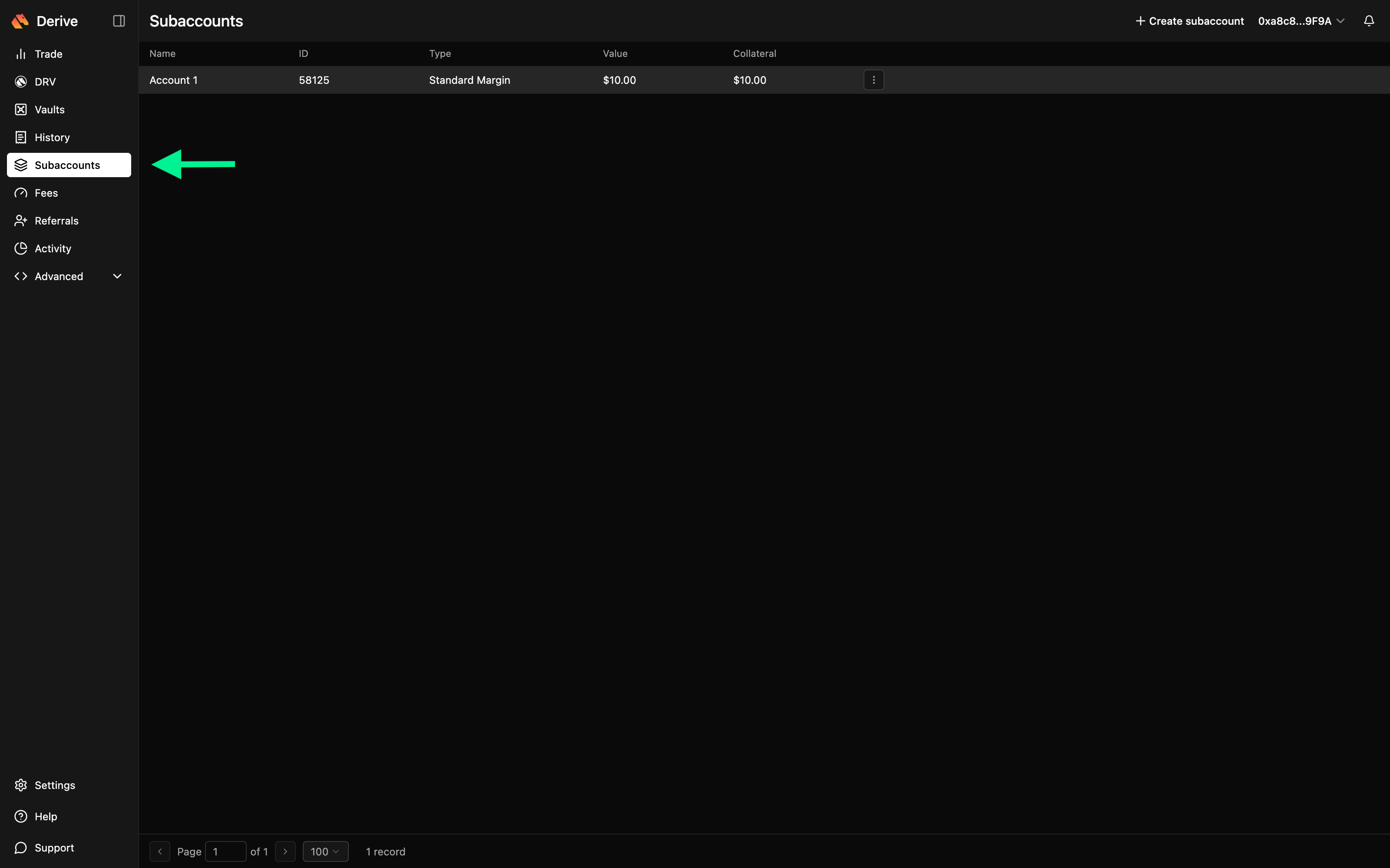 You may create several subaccounts all managed by the same Ethereum Wallet (EOA) / Derive Wallet (SCW). To do so, go to the Subaccounts page via the left-hand sidebar:
