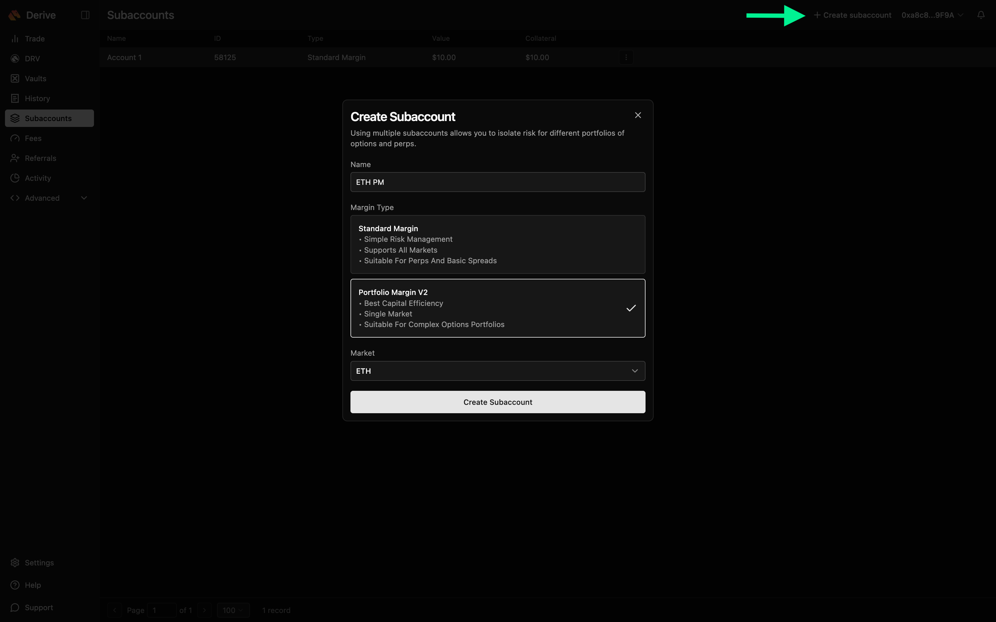 Here you will see your first subaccount with deposited funds. You may now click "Create Subaccount" and choose an account name and subaccount margin type:
