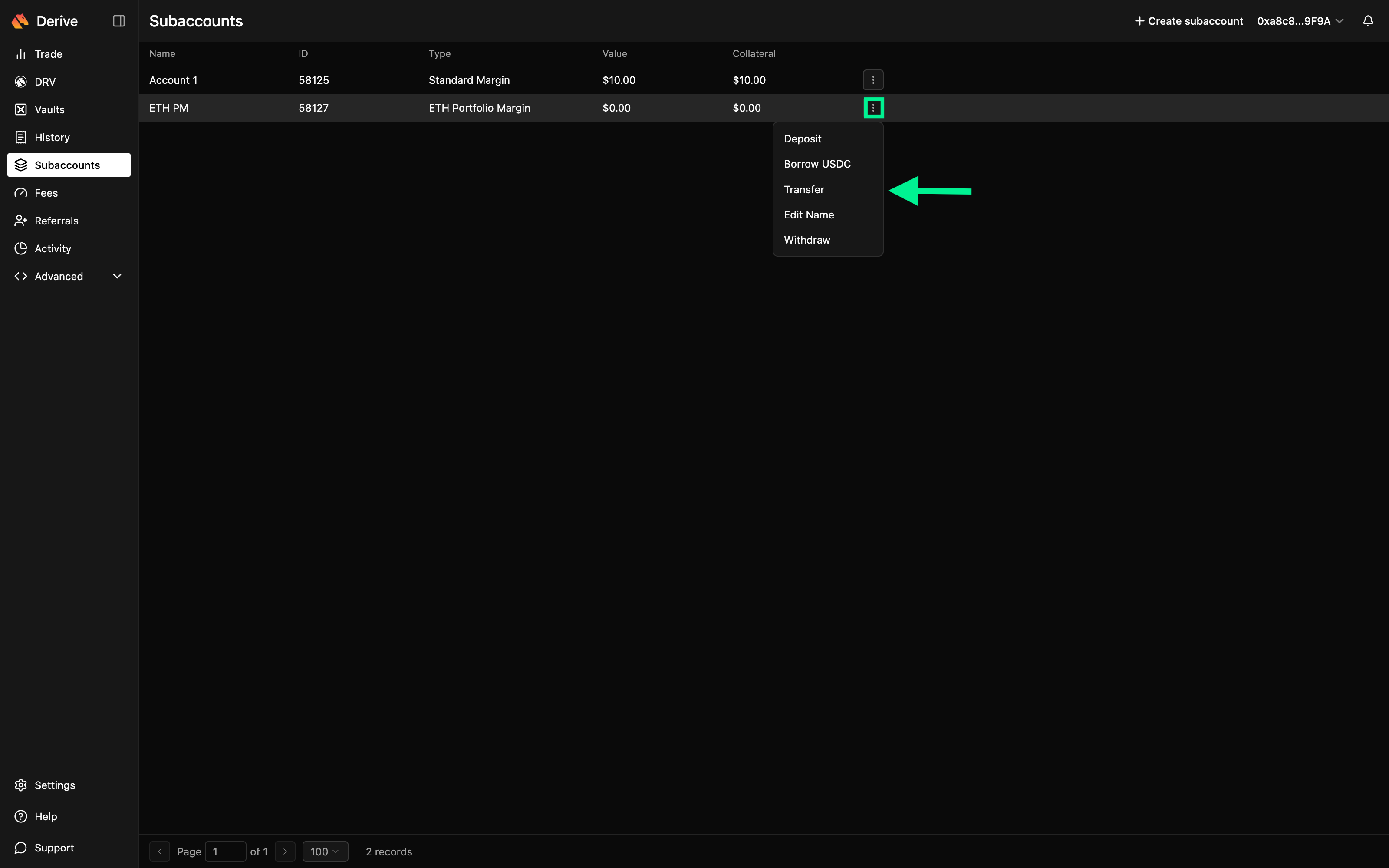 Once created, you can click on "Transfer" to move funds from your first subaccount to the newly created one.